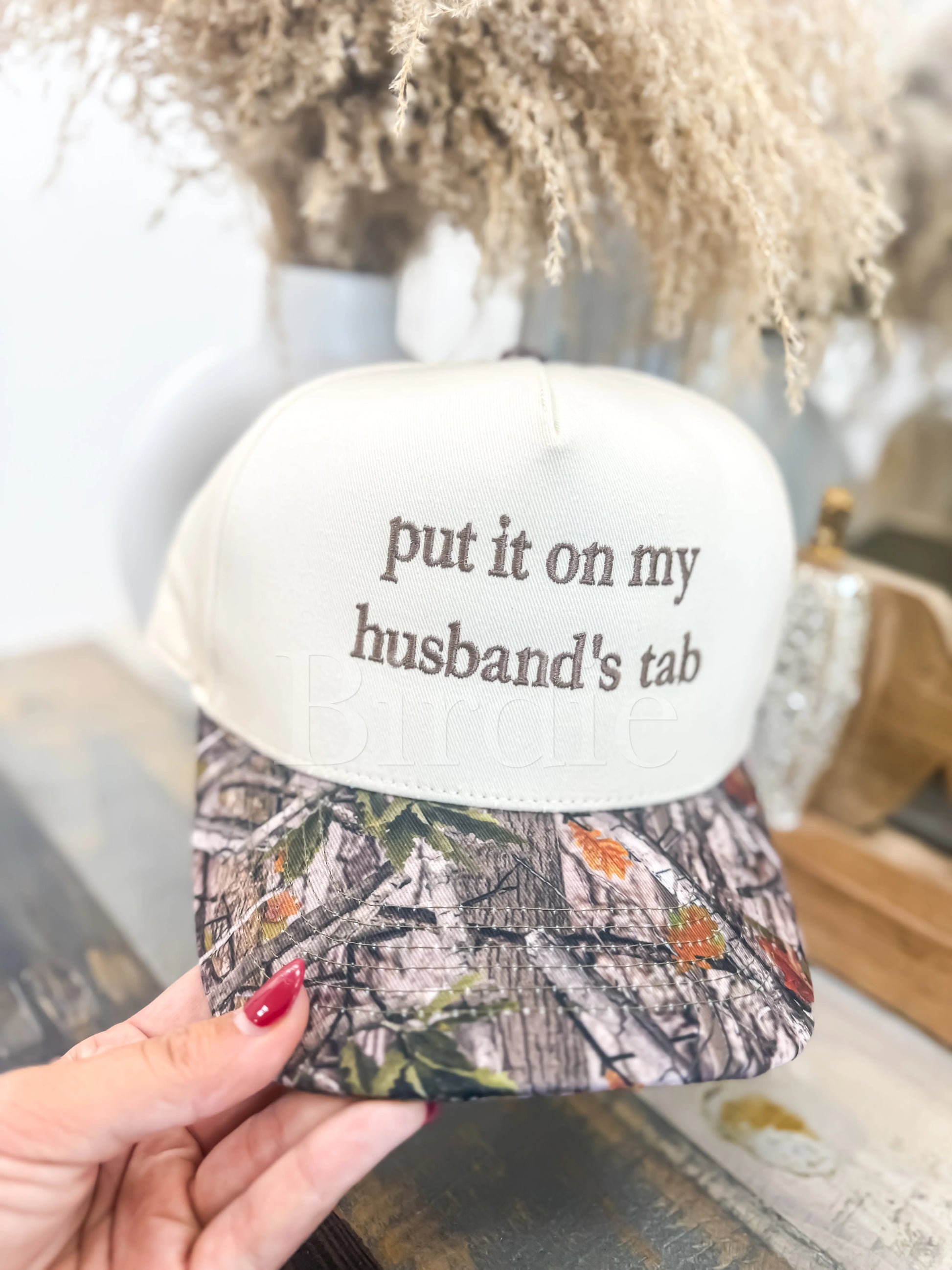Let your hat do the talking with this playful statement piece! Featuring a classic cream crown, a rugged camo bill, and bold embroidered text that reads “Put It On My Husband’s Tab,” this cap is perfect for the woman who knows how to have fun — and isn't afraid to show it.